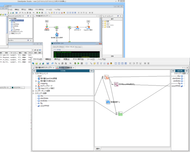 DataSpider Servistaはデータ連携フローの作成にGUIを採用。データの入出力はもちろん、変換や加工に必要な処理もアイコンのドラッグ&ドロップで行なえます。